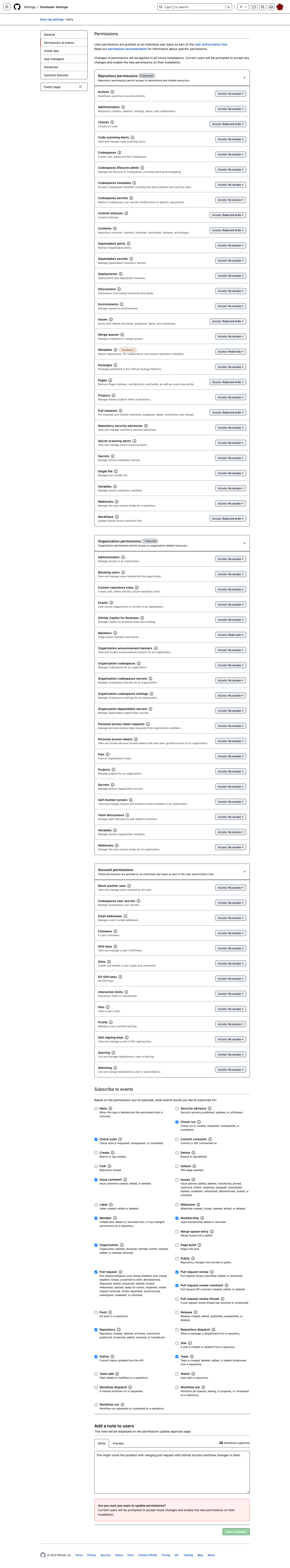 Issues must be set to Read & write because pull requests are issues. Issue comment events must be enabled to get the “bors r+” comments. If Issues is set to Read-only, repos will end up with pull requests that are marked as simultaneously merged and opened.
